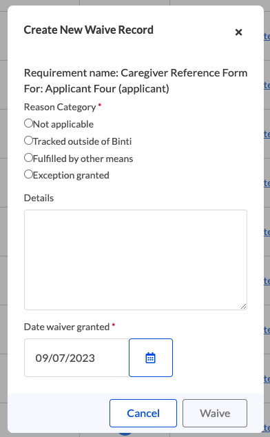 Building upon the current ability to mark a document as "Not Applicable," the new "Waive" feature allows agency workers to specify why a requirement is unnecessary for approval. This provides a robust tracking mechanism for supervisors and is useful during audits. Reason categories are customized per requirement and may include: not applicable, tracked externally to Binti, fulfilled through other means, or exception granted. An open-text box provides space for providing additional details and the date a waiver is granted is stored.