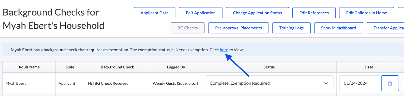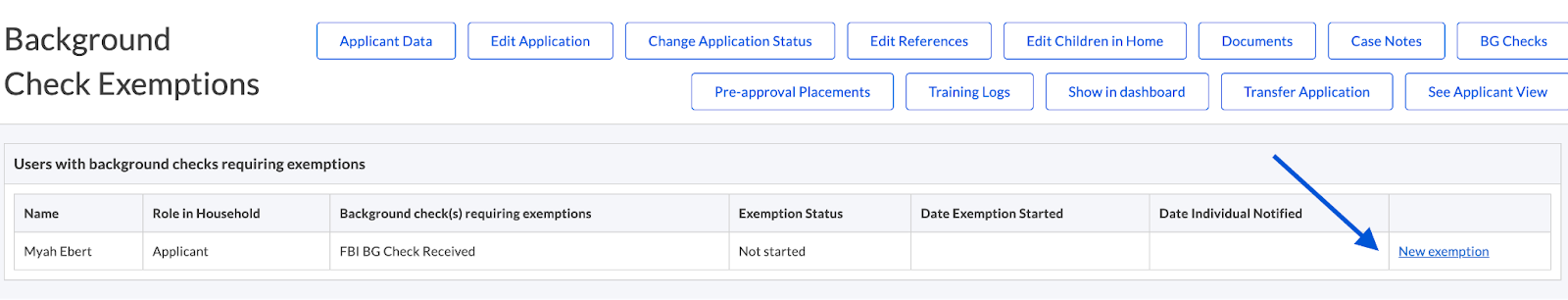 - On the Caregiver Applications dashboard there will be a link that says “Needs exemption” in the BG Checks column for this family