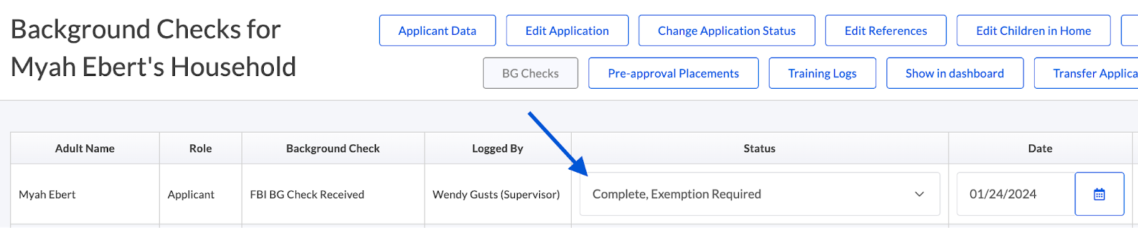 To indicate that a background check is required, change the status to "Complete, Exemption Required" for a background check listed on the Background Checks page for a caregiver.