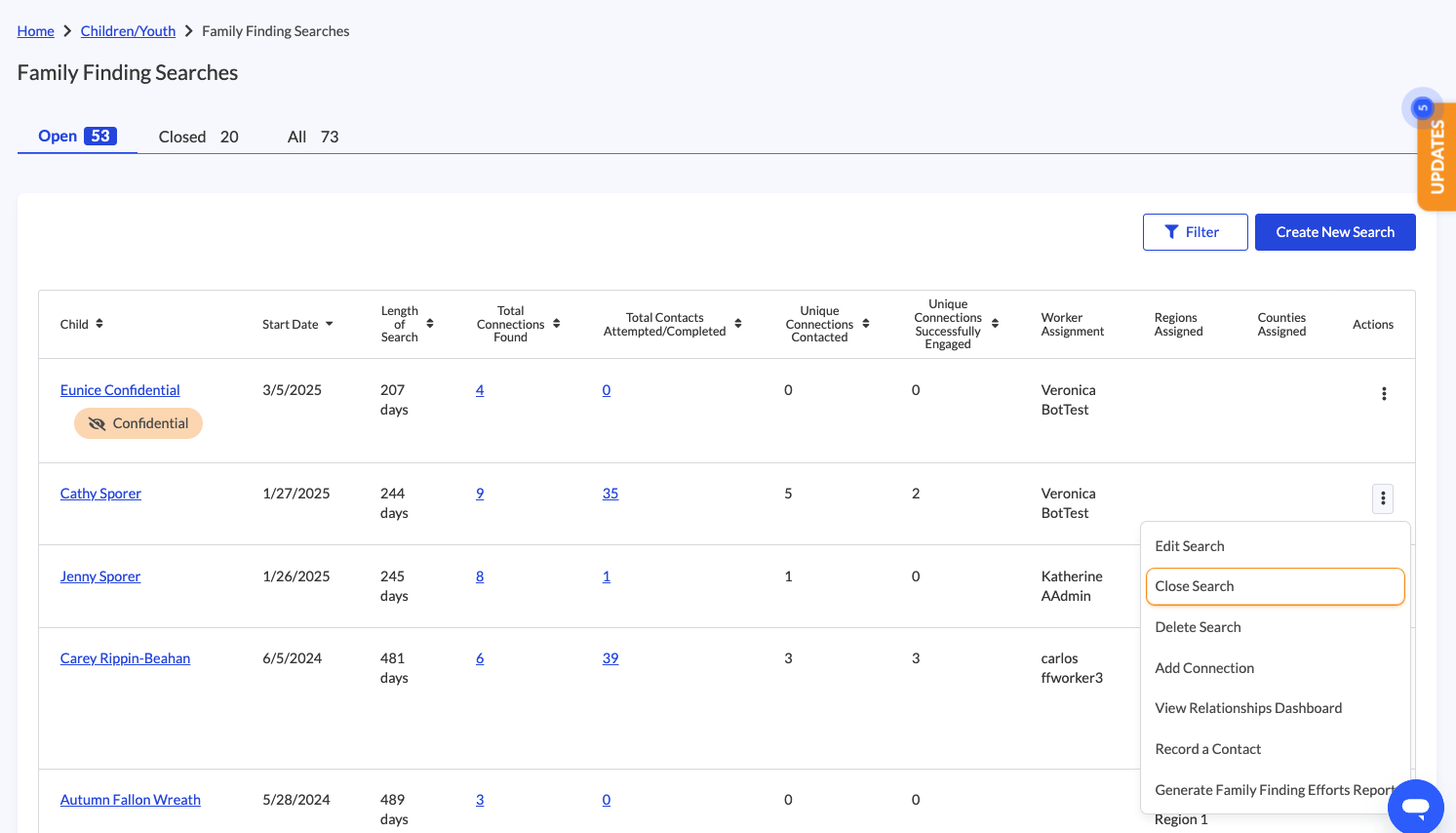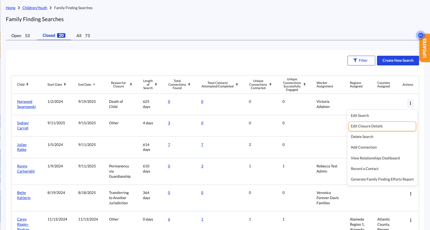 Family Finding & Engagement (FF&E) Search Close Reasons lets you capture why a search is closing and provide closure details, helping your team document the story behind every case. With this update, you now have new actions directly from the search: “Close Search” and “Edit Closure Details.”